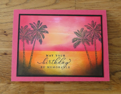 I used a Stampin Up stamp set called Timeless Tropical and kind of followed Michelle Zindorf's tutorial. For the ocean I used So Saffron, Mango Melody and Melon Mambo, for the sky Blushsing Bride, Melon Mambo and a touch of So Saffron.